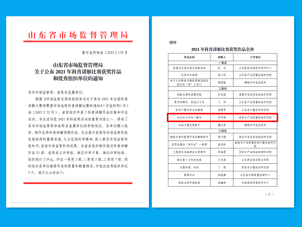 為更好的普及市場監管科技知識,根據《市場監管總局科技財務司關于舉辦2021年全國科普講解大賽預賽暨市場監管科普講解比賽的通知》(市監科財(司)函〔2021〕52號),我院積極參加了省市場監管局組織的科普講解作品征集和評比活動。本次活動,我院報送的《電動自行車你了解嗎》榮獲二等獎。