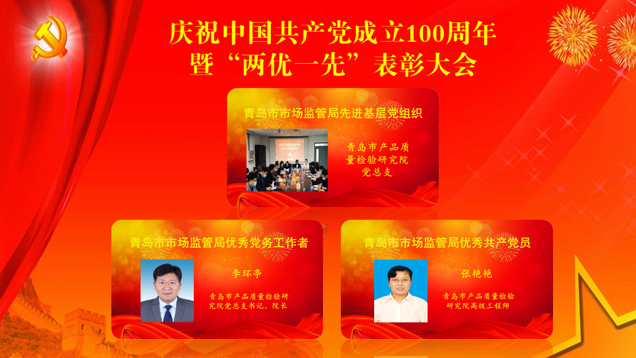 “兩優一先”獲表彰。我院第四黨支部張艷艷同志榮獲“優秀共產黨員”榮譽稱號,黨總支書記李環亭榮獲“優秀黨務工作者”榮譽稱號,中共青島市產品質量檢驗研究院總支部委員會榮獲“先進基層黨組織”榮譽稱號。