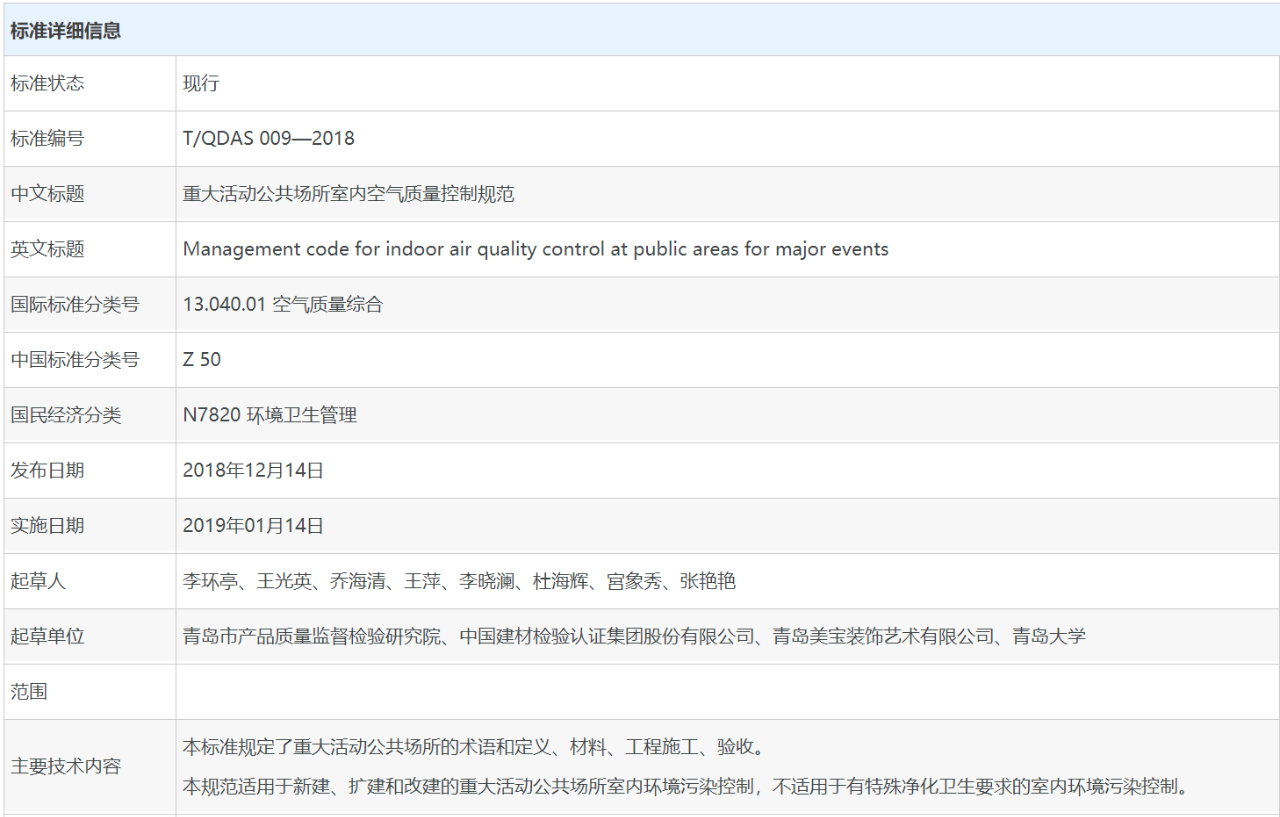 針對當(dāng)前新材料不斷涌現(xiàn),而現(xiàn)有標(biāo)準(zhǔn)相對滯后的情況,我們制定了專業(yè)標(biāo)準(zhǔn) T/QDAS 009-2018《重大活動公共場所室內(nèi)空氣質(zhì)量控制規(guī)范》,涵蓋了從建筑設(shè)計、裝飾裝修設(shè)計、裝修選材、運營保障選材、質(zhì)量控制直至室內(nèi)空氣質(zhì)量驗收等全過程的空氣質(zhì)量控制。