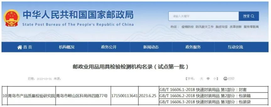 青島市質(zhì)檢院成為首批國家郵政業(yè)用品用具檢驗(yàn)檢測(cè)機(jī)構(gòu)